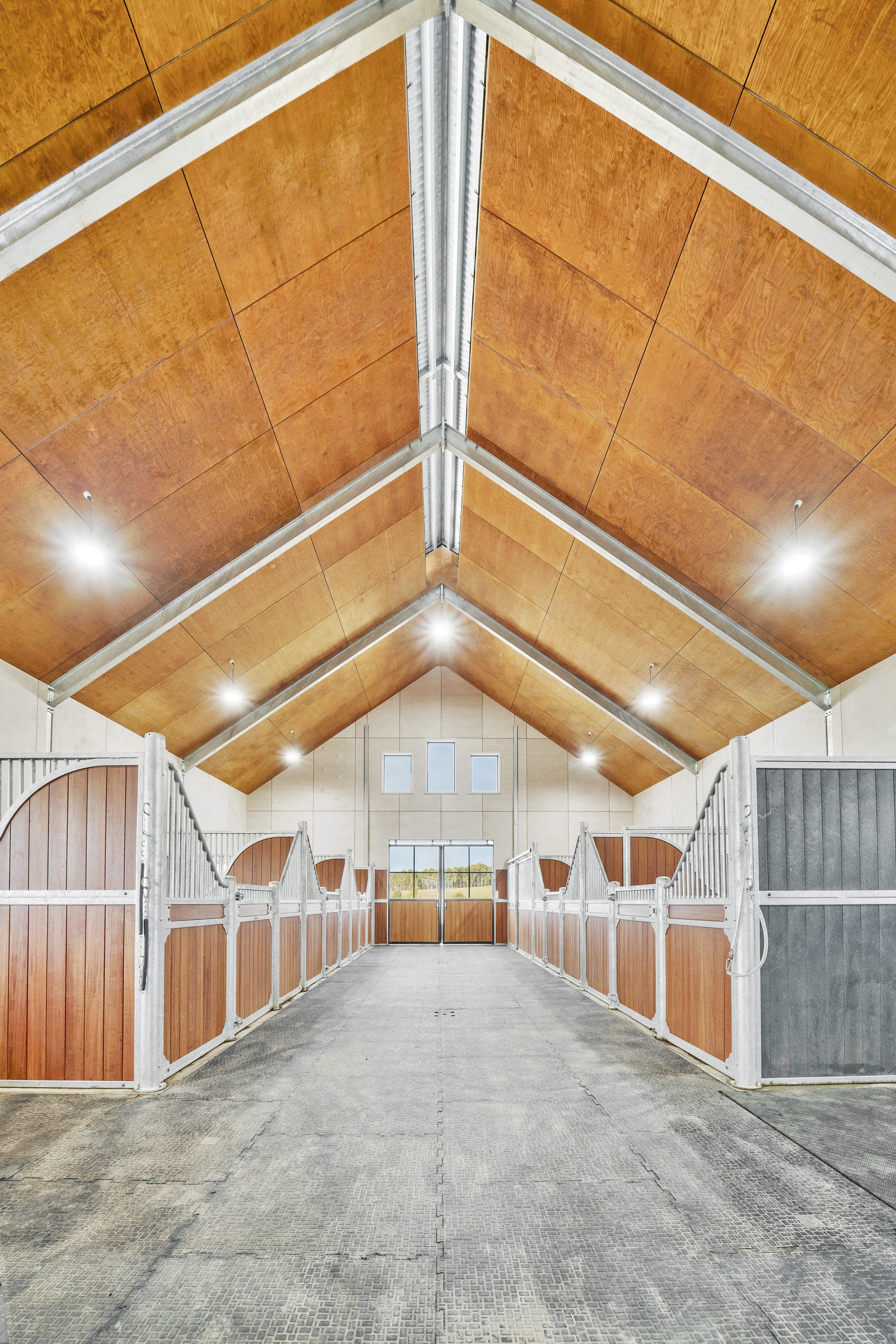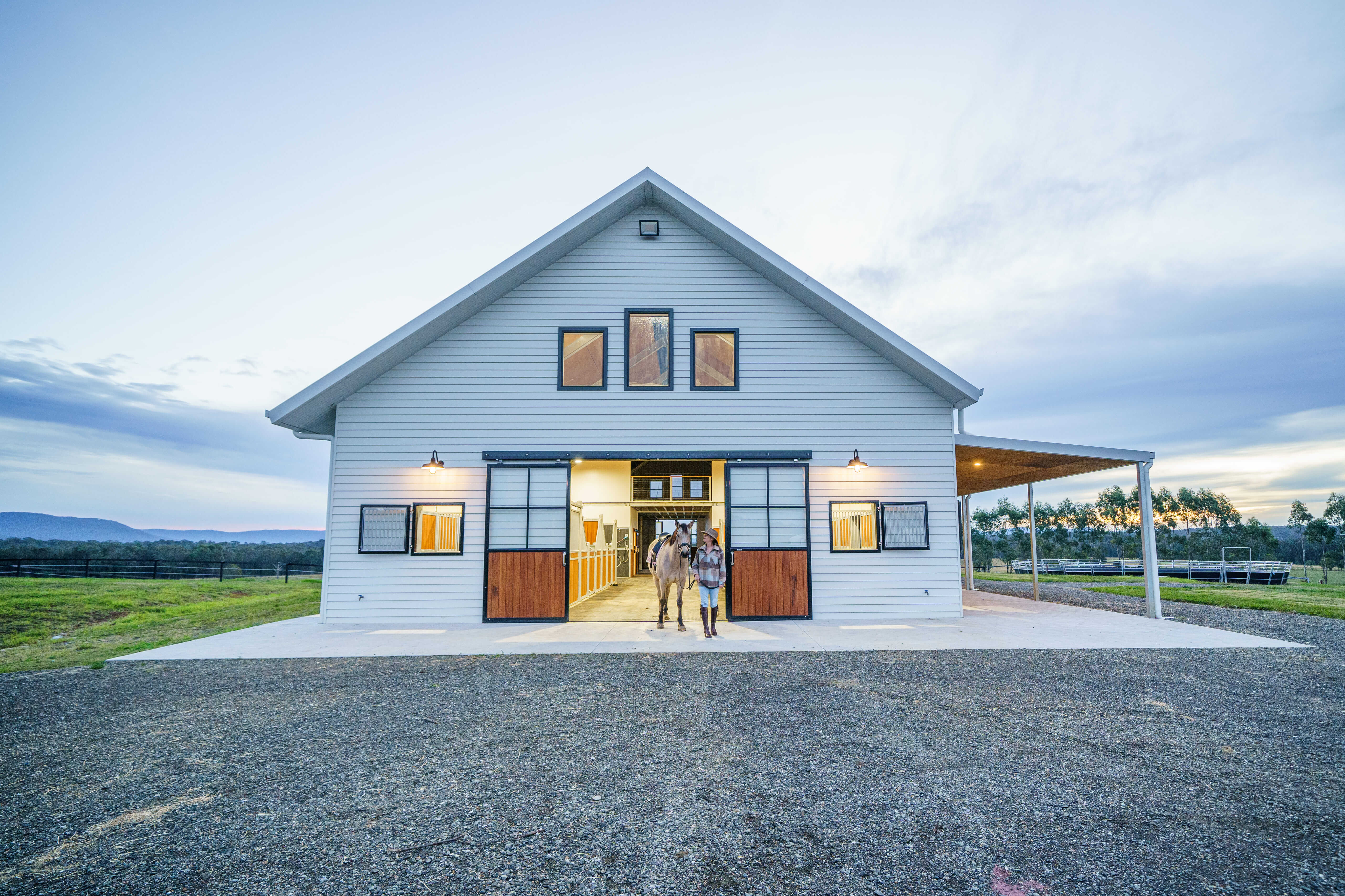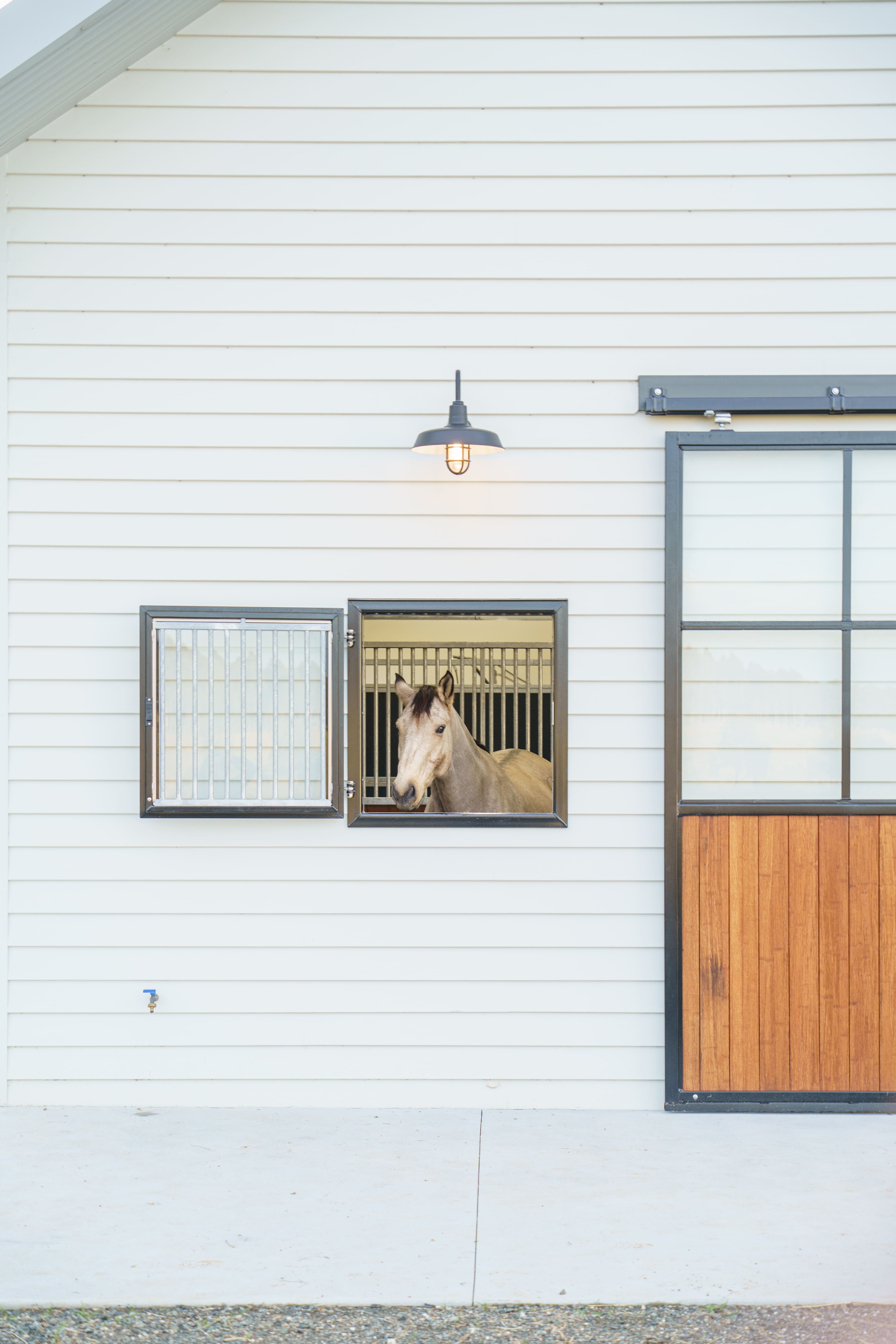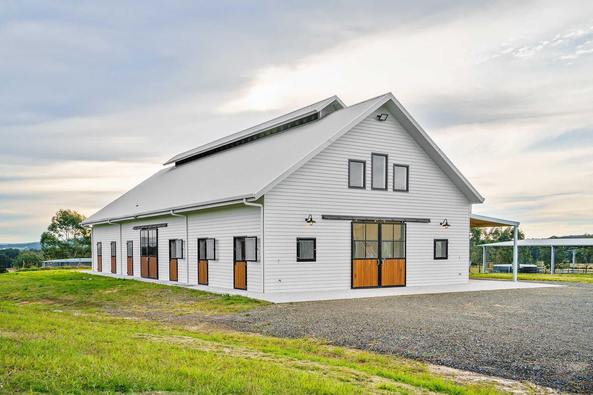 A traditional weatherboard clad barn building, with height to allow for a multi-purpose loft at one end. The generous height, large sliding door openings as well as the ridge vent assist in creating a healthy internal environment in a stables building that provides complete shelter from the elements. The stables enclosures feature one swinging divider panel to allow for conversion of two stables to one mare and foal box.